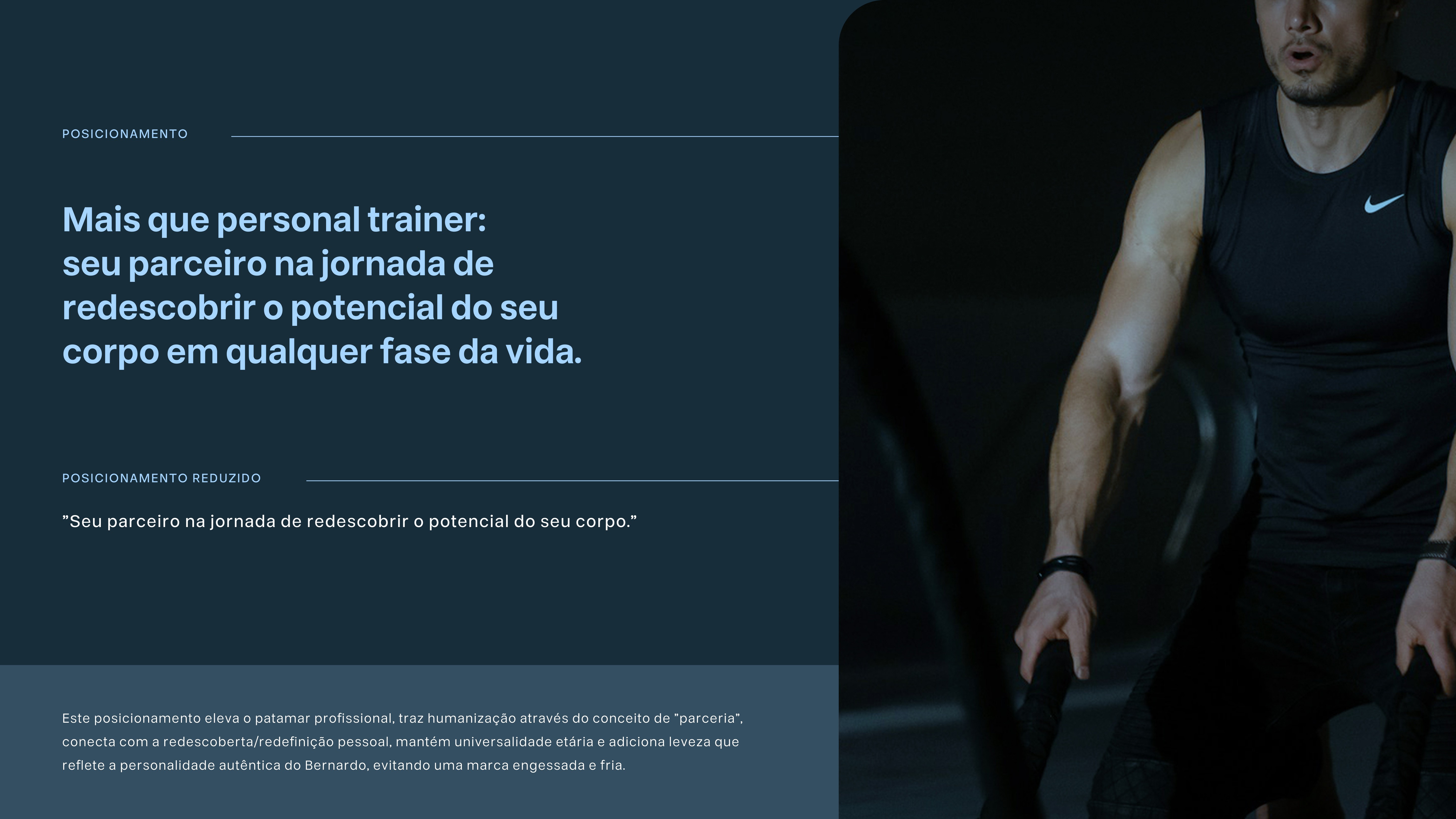 O ponto de virada do projeto foi o entendimento de que Bernardo não deveria ser comunicado apenas como um personal trainer, mas como alguém que caminha junto com seus clientes ao longo da jornada.